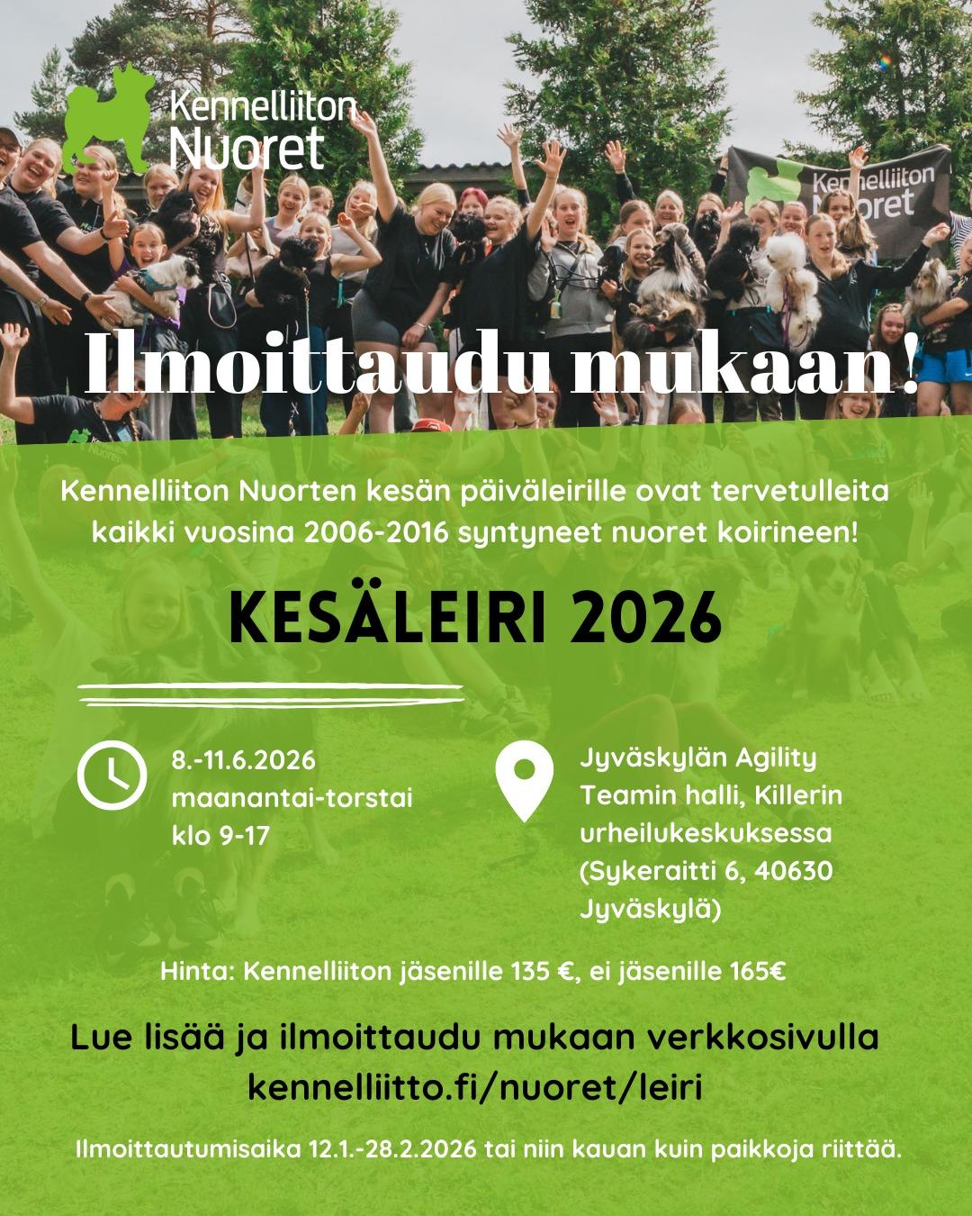 Kennelliiton nuorten kesäleiri järjestetään tänä vuonna yhteistyössä Keski-Suomen kennelpiirin kanssa. Leiri järjestetään päiväleirinä Jyväskylässä maanantaista torstaihin 8.-11.6.2026. Lisätiedot…