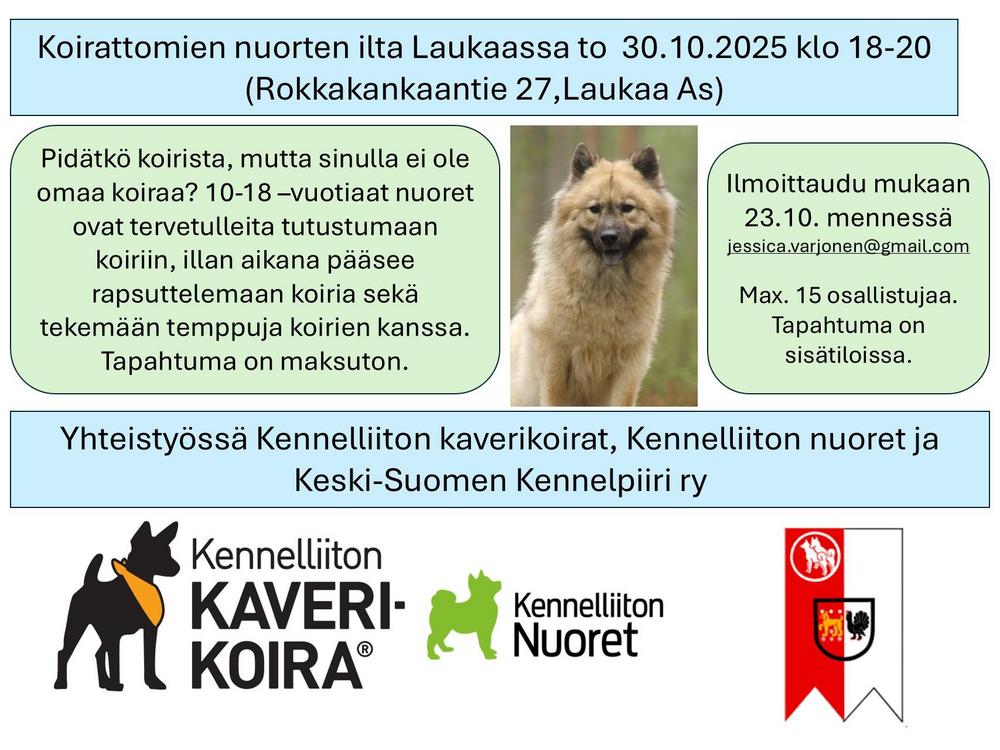 Kennelpiirin tiloissa järjestetään tapahtuma nuorille, joilla ei ole koiraa, mutta jotka haluaisivat viettää aikaa koirien kanssa. Tämän koirattomille nuorille suunnatun illan aikana pääsee…